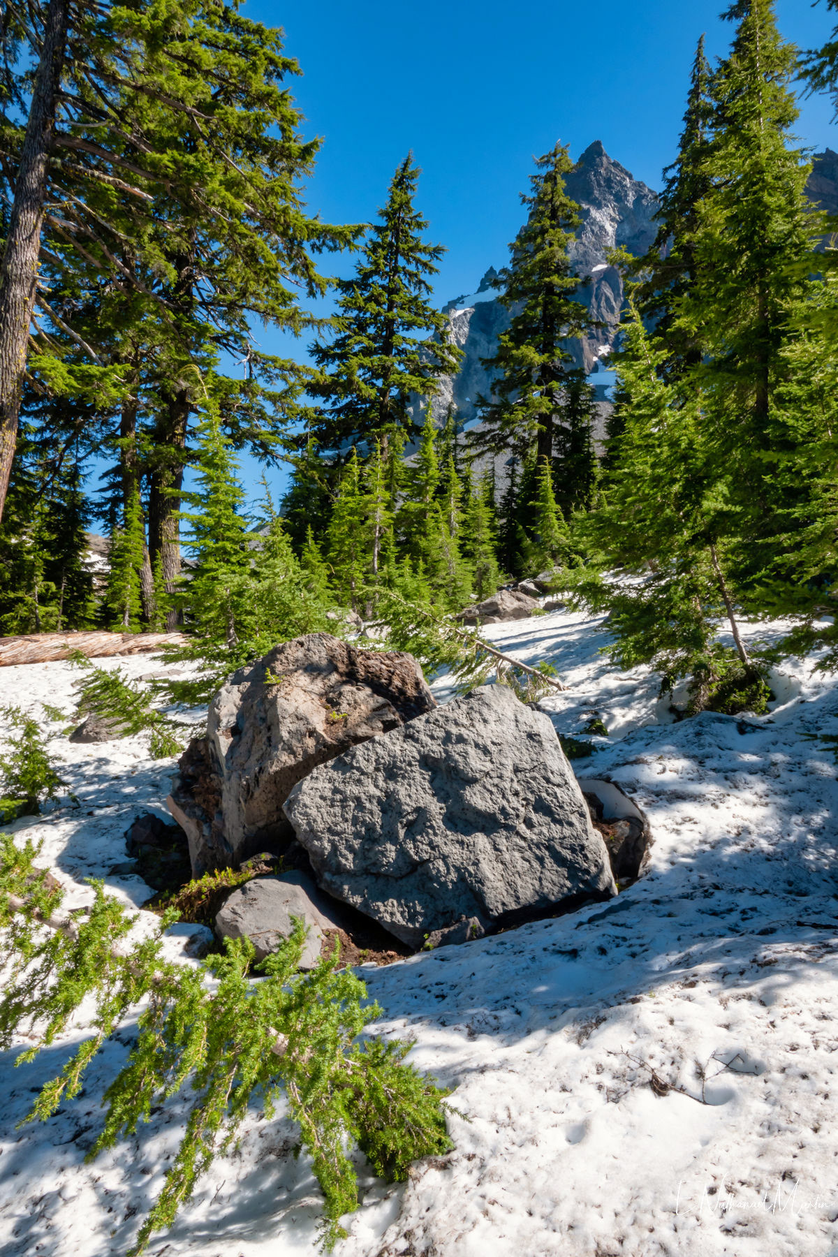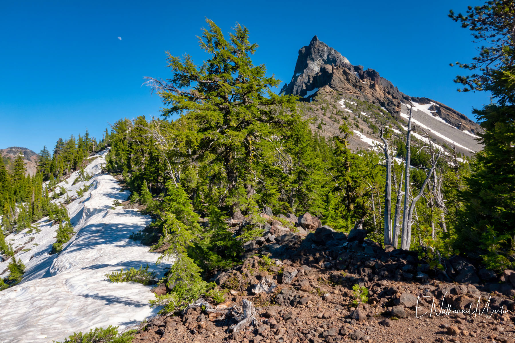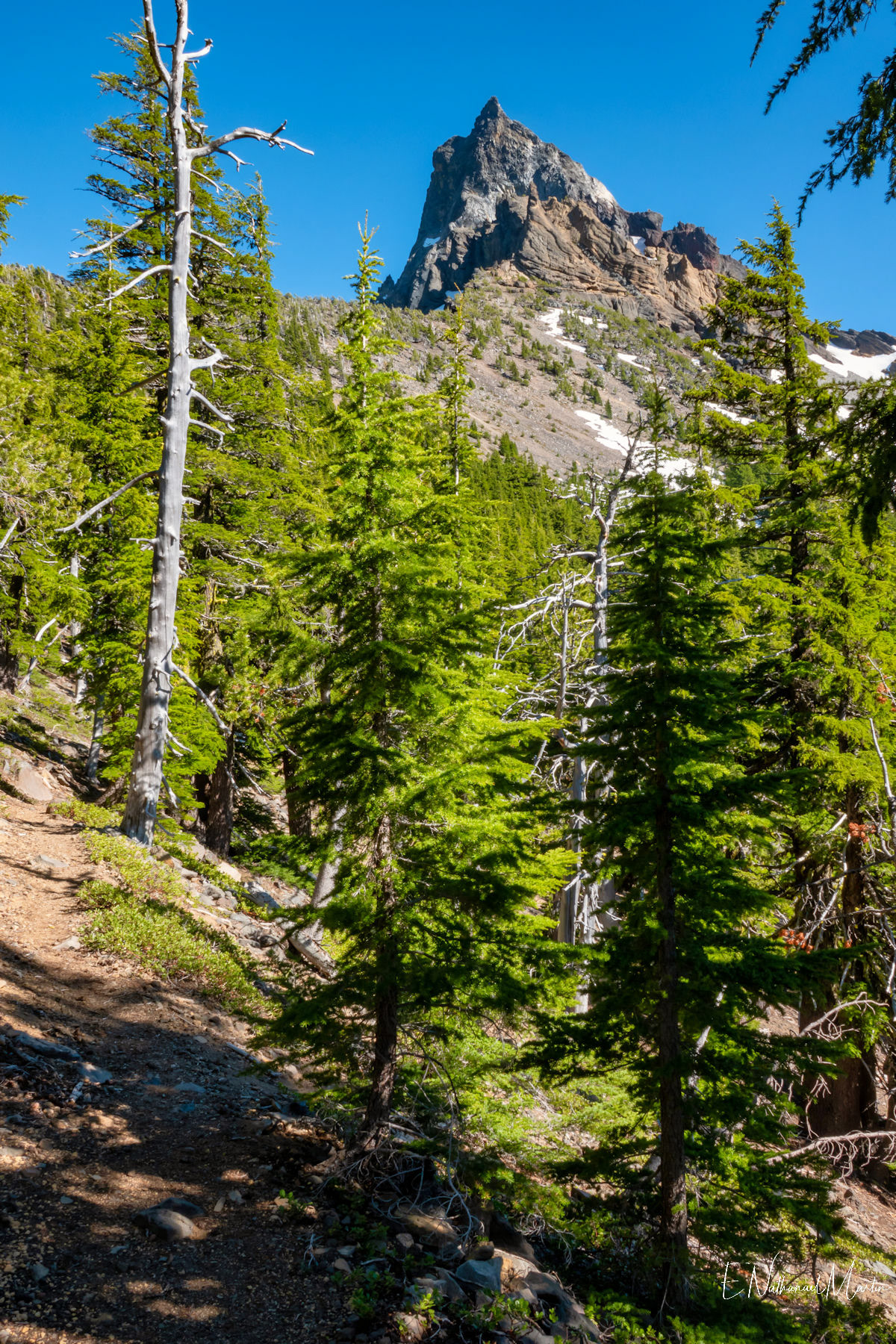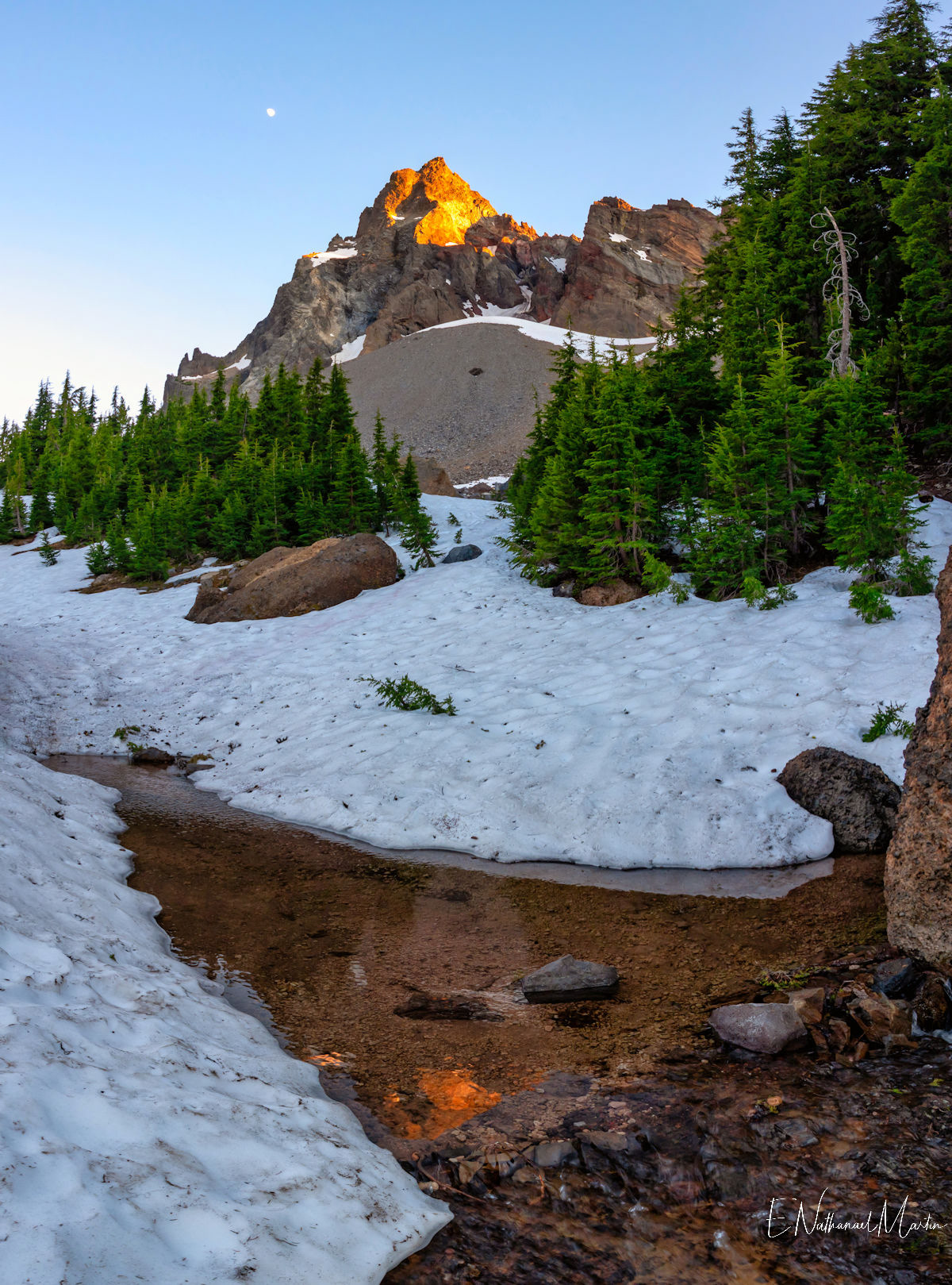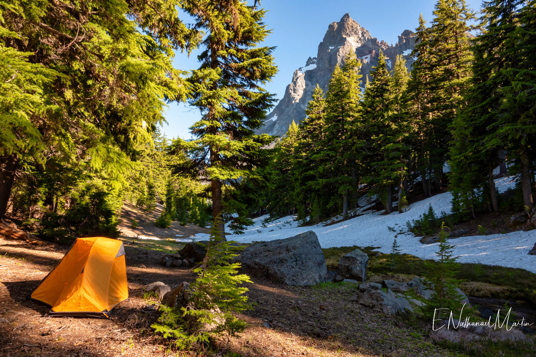 The third weekend in June 2021 I had hoped to visit Steens Mountain in Eastern Oregon...but the road to the summit which is the highest in the state did not reopen in time. While I was concerned it was a bit too early, I decided to try my first overnight backpack trip...up to the relatively small and often overlooked Mt Thielsen. It's just a few miles from Crater Lake and Diamond Lake which both draw big crowds who usually only drive past Thielsen on the highway. But I've recently discovered that some of the most incredibly beautiful gems of Oregon are these small, overlooked mountains. It was a little early -- there was still a lot of snow which made hiking further on the PCT difficult, but I made it up to the meadows right under the mountain which were my goal and it was just as beautiful as I'd expected. It was really fun to be able to sleep near the best view, waking up and catching the stunning alpenglow at 5:30am!